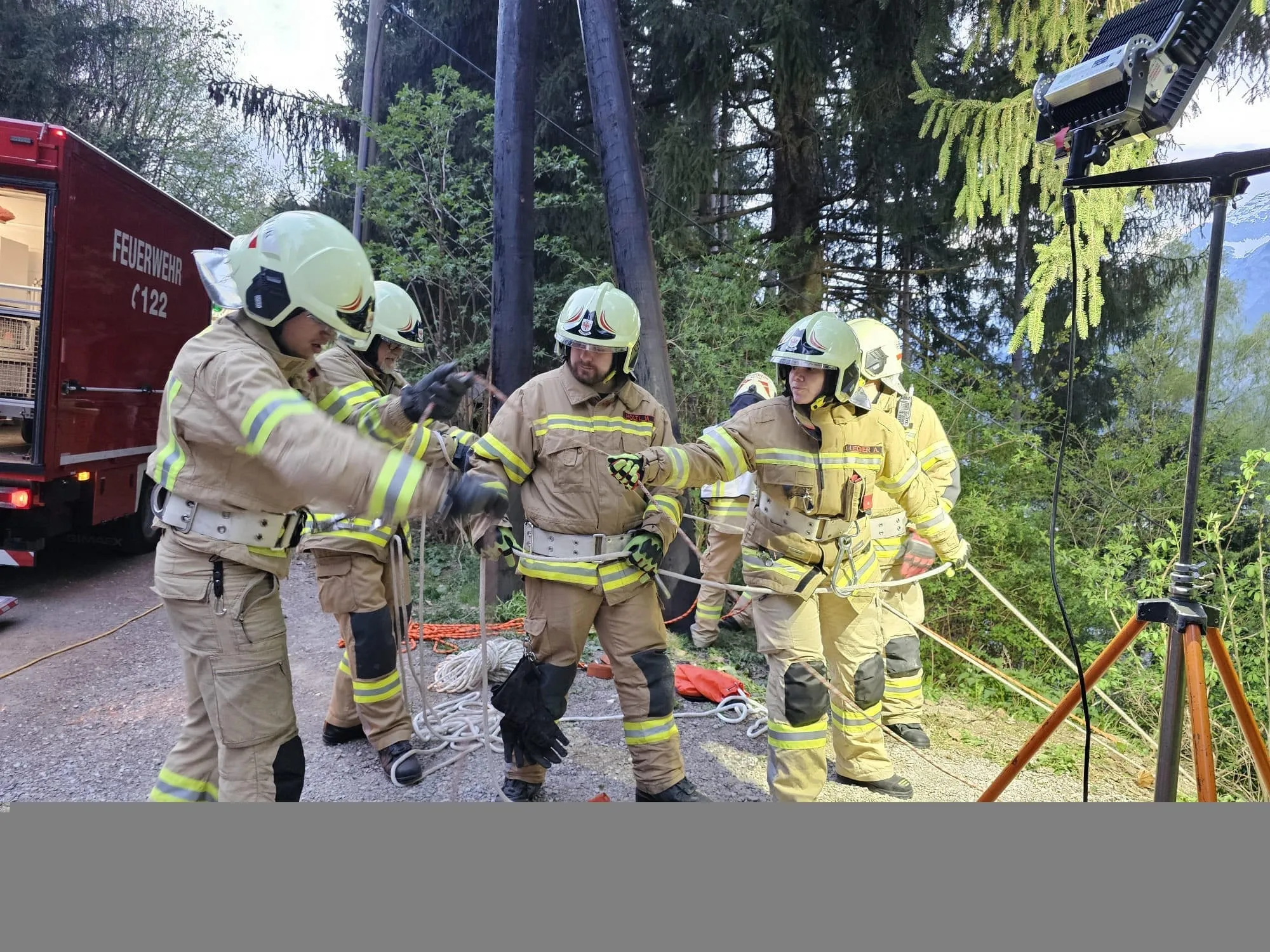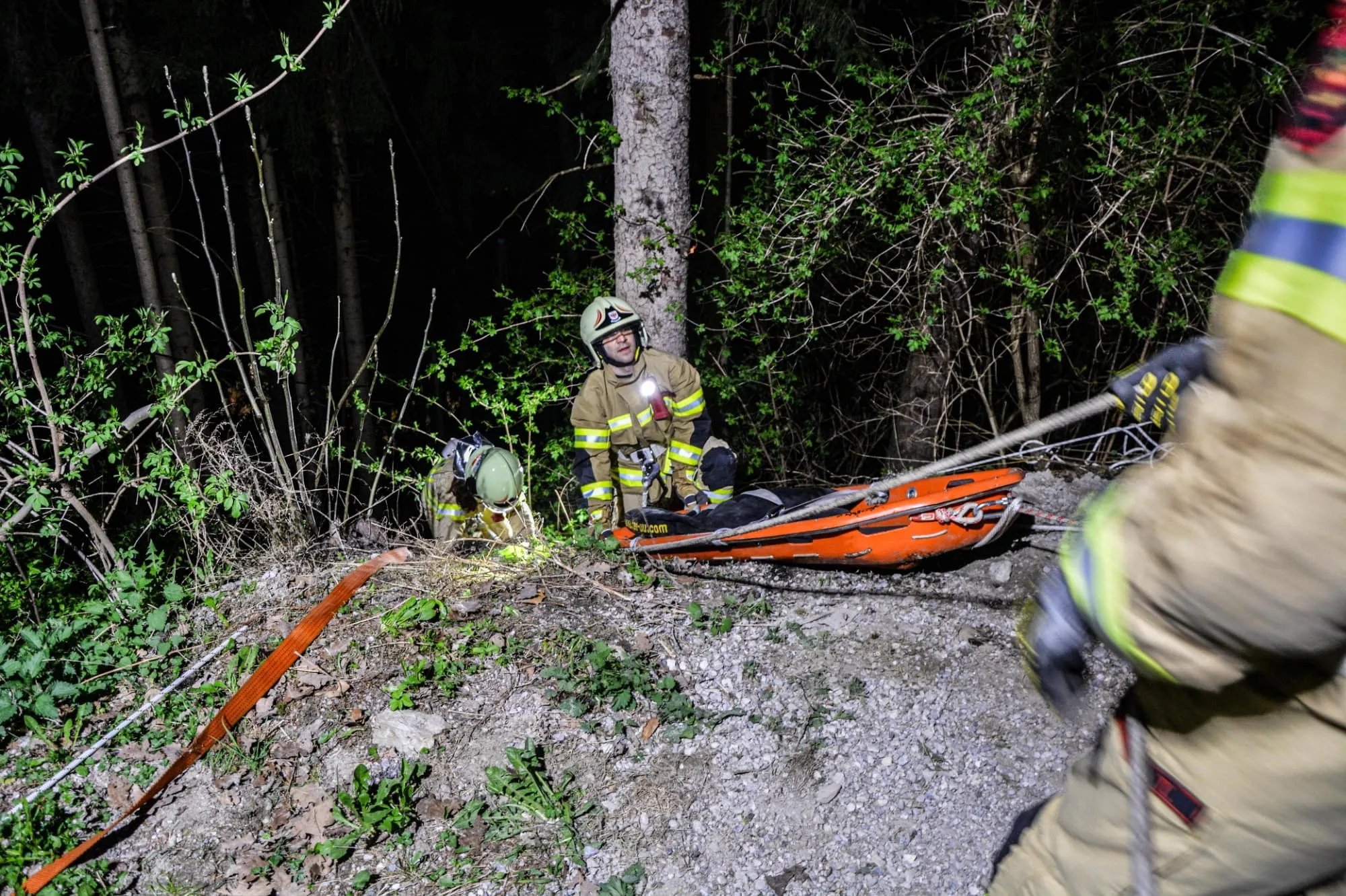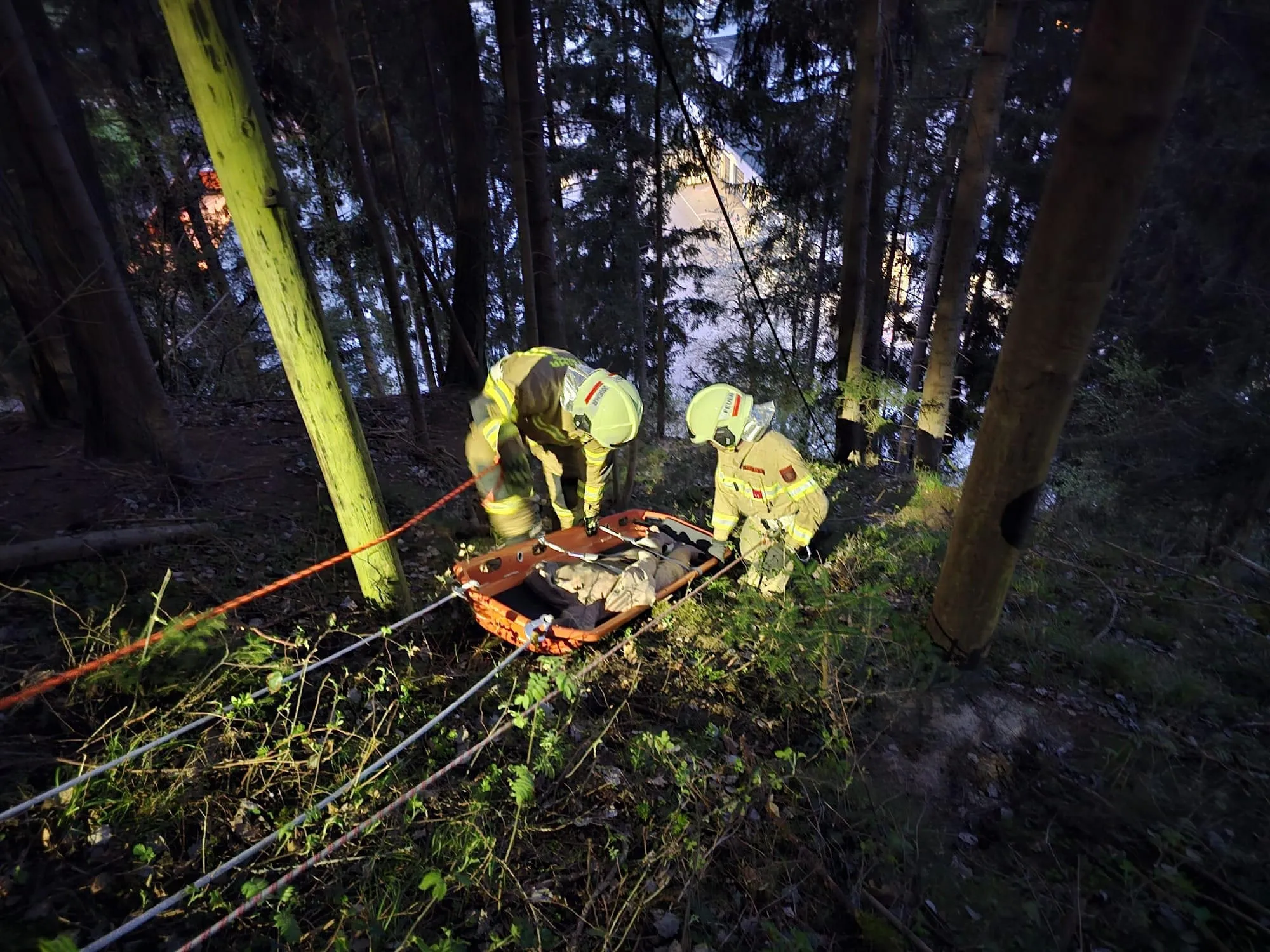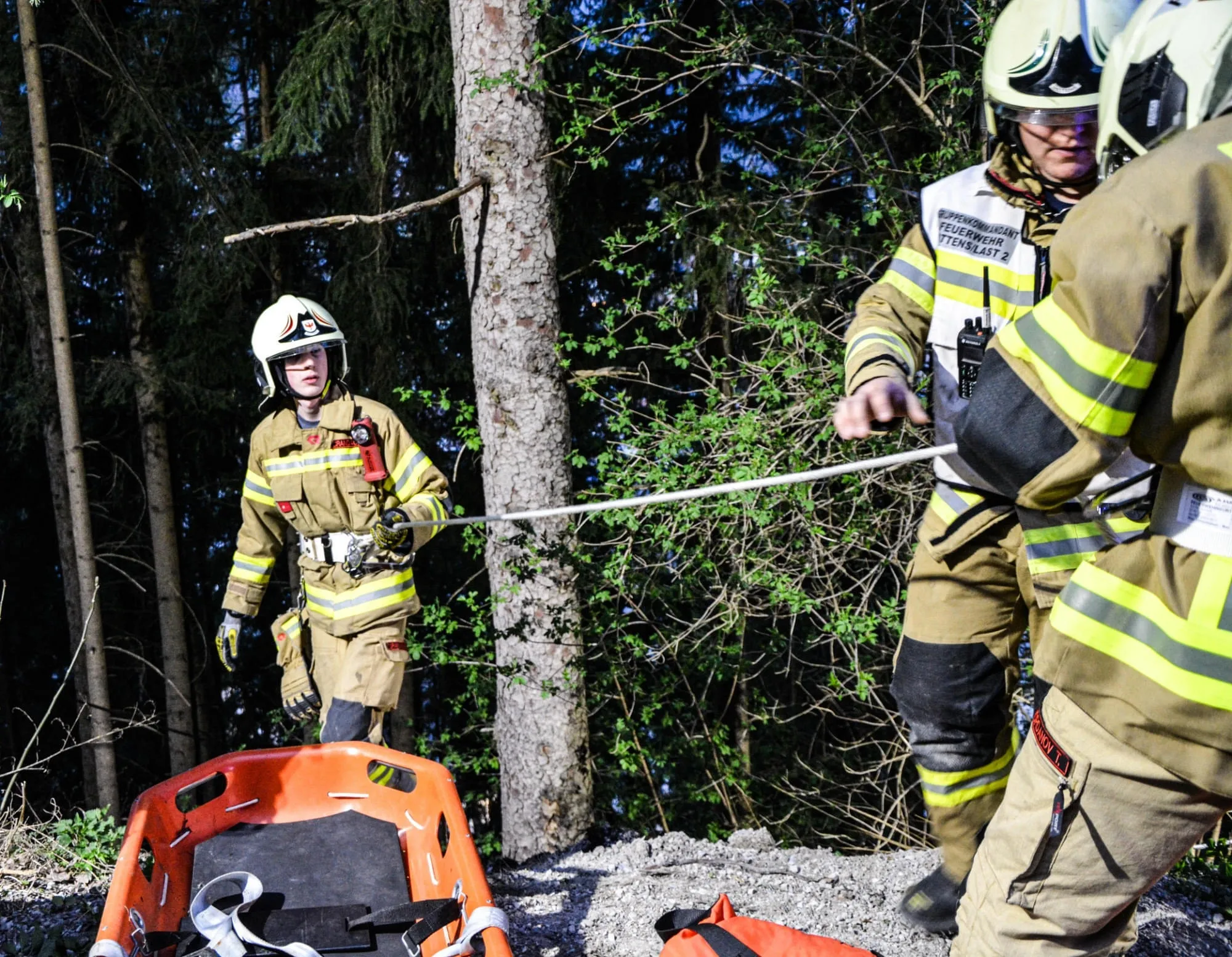 In einem der Übungsszenarien lag der Schwerpunkt auf der Rettung zweier im Wald abgestürzter Personen. Diese mussten unter Einsatz einfacher Mittel wie Leinen und Schleifkorbtrage aus schwierigem Gelände schonend gerettet werden.